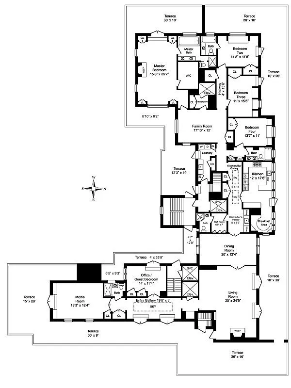 Full floor 5 bedroom penthouse in a prewar Park Avenue coop with wraparound terraces showcasing iconic views of Manhattan in every direction. Total renovation just finished, featuring a classic prewar layout, top-of-the-line finishes and technology. A dramatic marble gallery leads to a large living room with fireplace, a dining room with bar/butler's pantry, a fully equipped media room, full bath & office/guestroom.