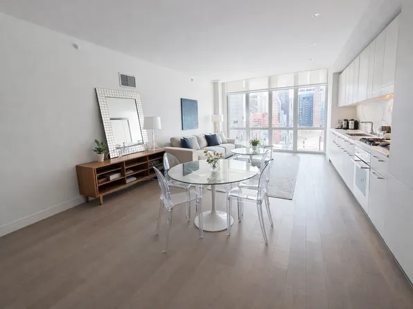 A brilliant oversized one bedroom apartment featuring large windows that offer an abundance of natural light, walnut wood flooring, generous closet space, a moveable island kitchen with quartz countertops and concealed top of the line appliances, in-unit Bosch washer/dryer and spacious windowed bathroom.