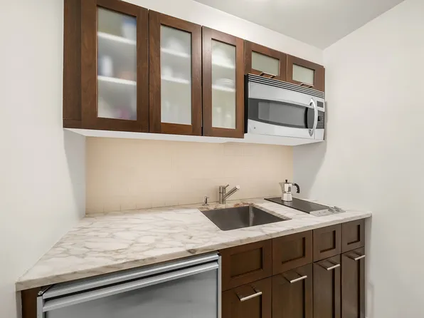 Live in this stylish alcove studio with separate sleeping area, full-sized kitchen featuring custom Italian cabinetry, Caesarstone countertops, Bosch appliances, pull-out pantry and eating bar. This fantastic studio also includes a stunning terrazzo bath with heated flooring, high ceilings, an in-unit Bosch...