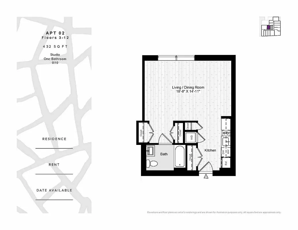 This well designed studio apartment includes an in-unit washer/dryer, a modern gourmet kitchen with stainless steel appliances including an induction cooktop and Caesarstone quartz countertops, multiple closets, wood floors, 9' ceilings, and over-sized windows.