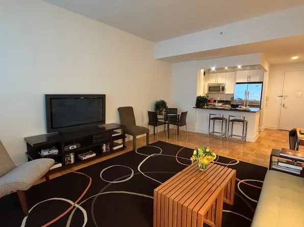 High Floor, Split Layout 1 Bedroom with Den. Den Area is Ideal for Dining, Home Office, Etc. Wide Window Walls in Living Room & Bedroom. Brand New European Wood Plank Flooring Just Installed. Just Upgraded Windowed Open Loft Kitchen with Granite Dining Bar, Subway-Tiled Backsplash and Track Lighting, All Brand New Stainless Steel Appliances. Three Closets – Entry, Bedroom & Linen Closets.