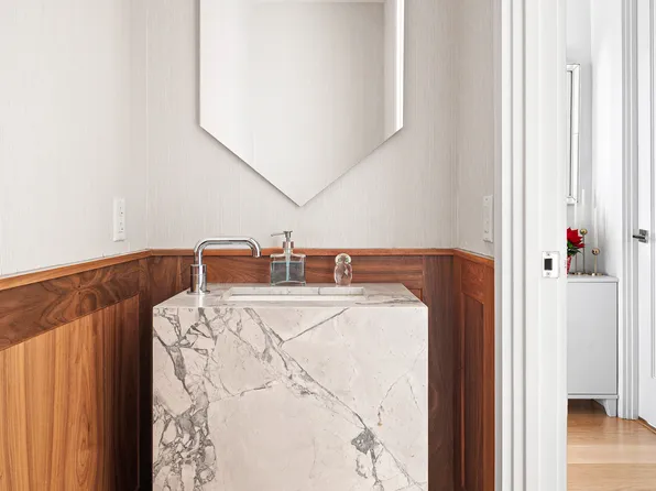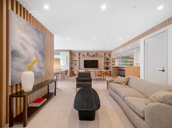The sprawling room has floor-to-ceiling windows that offer an abundance of natural light and 9ft ceilings. Six-inch wide walnut floors are a perfect compliment to the neutral warm palette of finishes throughout.