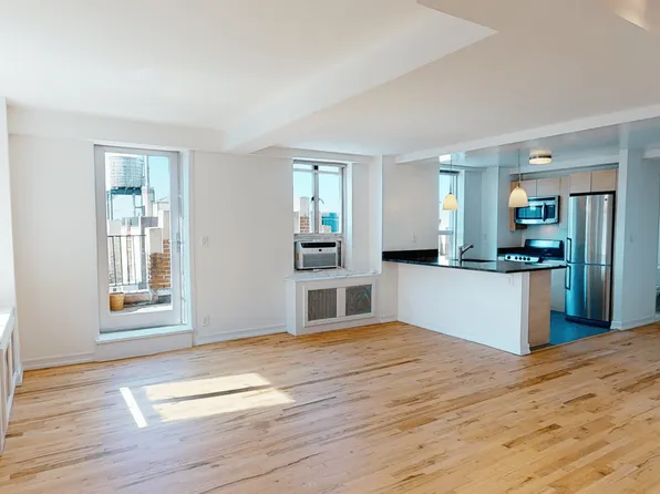 Residence 29D is a sun-filled one-bedroom rental offering unobstructed eastern views through oversized windows. The layout is efficient and airy, with a seamless living and dining area, a well-proportioned bedroom with excellent natural light, and a windowed bathroom with a walk-in shower.