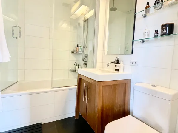 Sun filled bright apartment with good closet space, open kitchen with stainless steel full-sized appliances, marble bathroom.