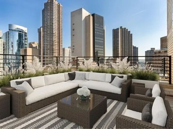 The north/west corner living room has wraparound floor-to-ceiling, sound-attenuated windows, enveloping the area in light. The stylish open kitchen with a large marble island also benefits from a wall of glass.
