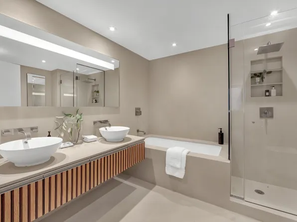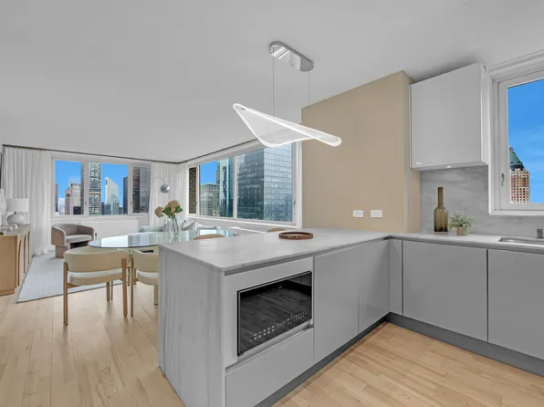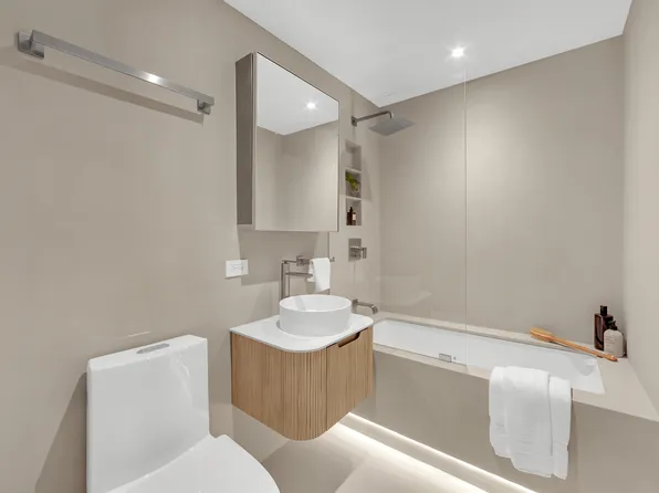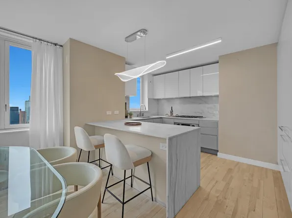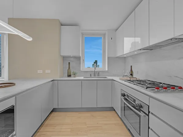 Spacious three-bedroom atop the city with north and west exposures and open views. Features include an open kitchen with dining area, large living room, and three sizable bedrooms. The master offers his-and-hers walk-in closets, a limestone bathroom with double vanity, marble countertops, Zuma soaking tub, and Dornbracht fittings. Additional amenities: wine chiller, floor-to-ceiling windows, 9-foot ceilings, four-wide white oak floors, washer/dryer.