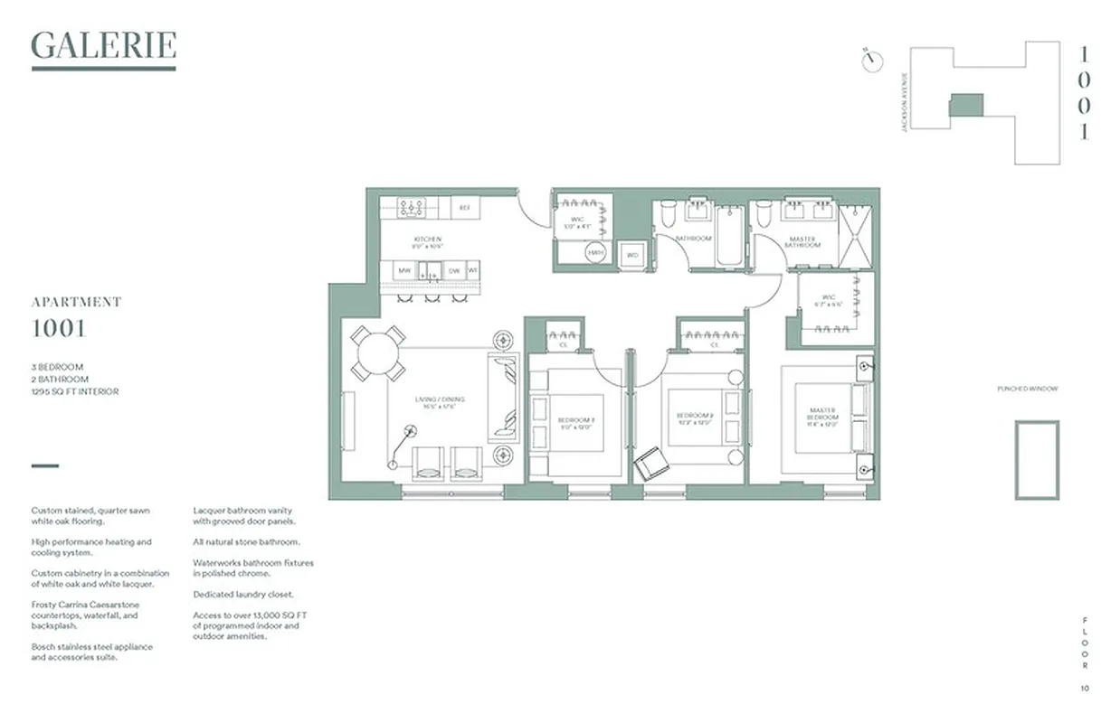 Perched on the 10th floor of GALERIE this well-appointed three bedroom, two bath home is thoughtfully planed. The sunny exposure overlooks the curated courtyard. The master suite is graciously appointed with a walk-in closet and spa-like master bath.