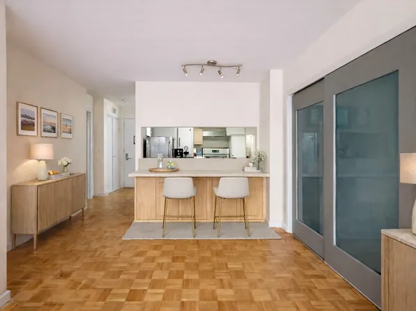 The galley kitchen boasts full-size stainless steel appliances, including a dishwasher and over-the-range microwave, complemented by a marble bathroom.
