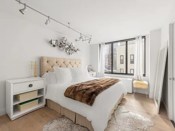 Available May 8! Steps from Fifth Avenue, this high floor two bedroom/two bath home features endless views and brilliant light from every south facing window. This well laid out home features its own private balcony, an open living/dining room, Miele washer/dryer, tons of closet space, a wood-burning fireplace, and hardwood floors throughout.
