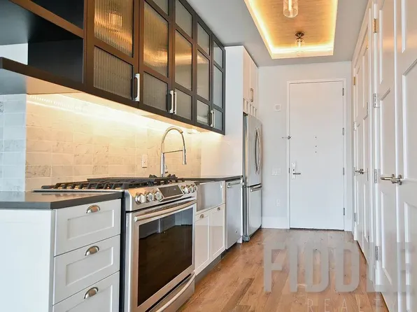 - Galley kitchen with lots of cabinets and stainless steel appliances
