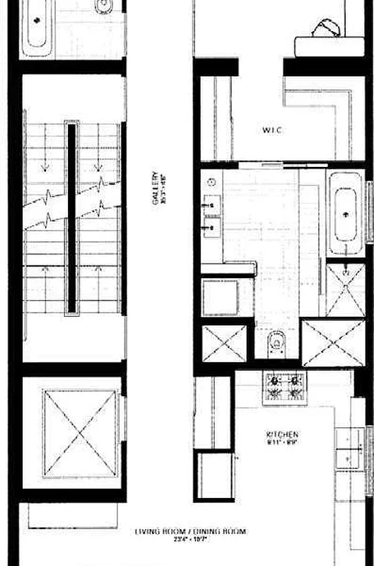 Loft-like, floor-through apartments present wall-to-wall southern vista, unobstructed by the balustrades which appear as scrims when sunlit. Columns and high ceilings of refined concrete and wide-plank hardwood floors set the base tones of the buildings interior palette. Strategically placed picture windows frame cross-town glimpses.