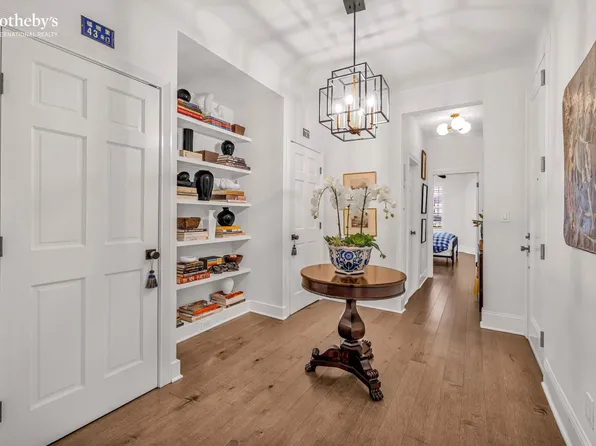 The juxtaposition of old and new is evident upon entering the duplex’s lower level. The foyer features an original stained-glass window, as well as custom built-in closets and a well-placed powder room.