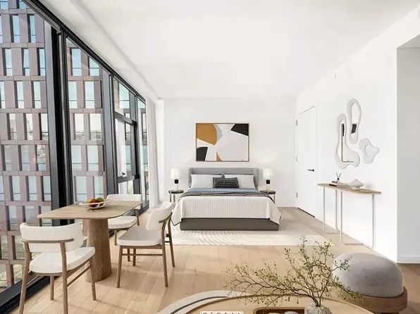 Oversized studio with corner floor to ceiling windows, separate sleeping area, and large u-shaped chef style kitchen with Caesarstone countertops and stainless steel appliances. Apartment also features an in-unit Bosch washer/dryer, and contemporary bath with rain shower head.