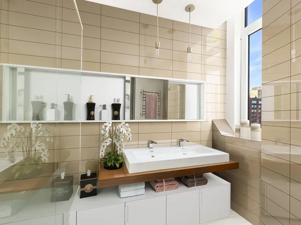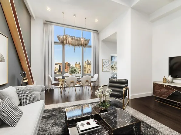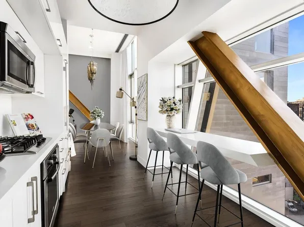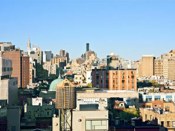 Perfectly located at the convergence of NoHo, Greenwich Village, Union Square, and the East Village, this one of a kind corner loft in the sky designed by Roman & Williams offers impressive scale, architectural interest, and dramatic vistas. Featuring 14.5' beamed ceilings, 8 near floor-to-ceiling orig.
