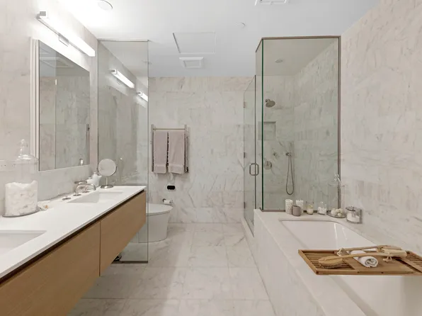 Welcome to this gleaming full-floor loft at TriBeCa’s newest luxury tower, a stunning 2-bedroom, 2-bathroom home suffused with Lower Manhattan views and northern and southern light. Two frameless balconies, one south facing and one north facing, offer fresh air and stylish settings for sunset drinks, urban gardening, and easy warm-weather lounging.