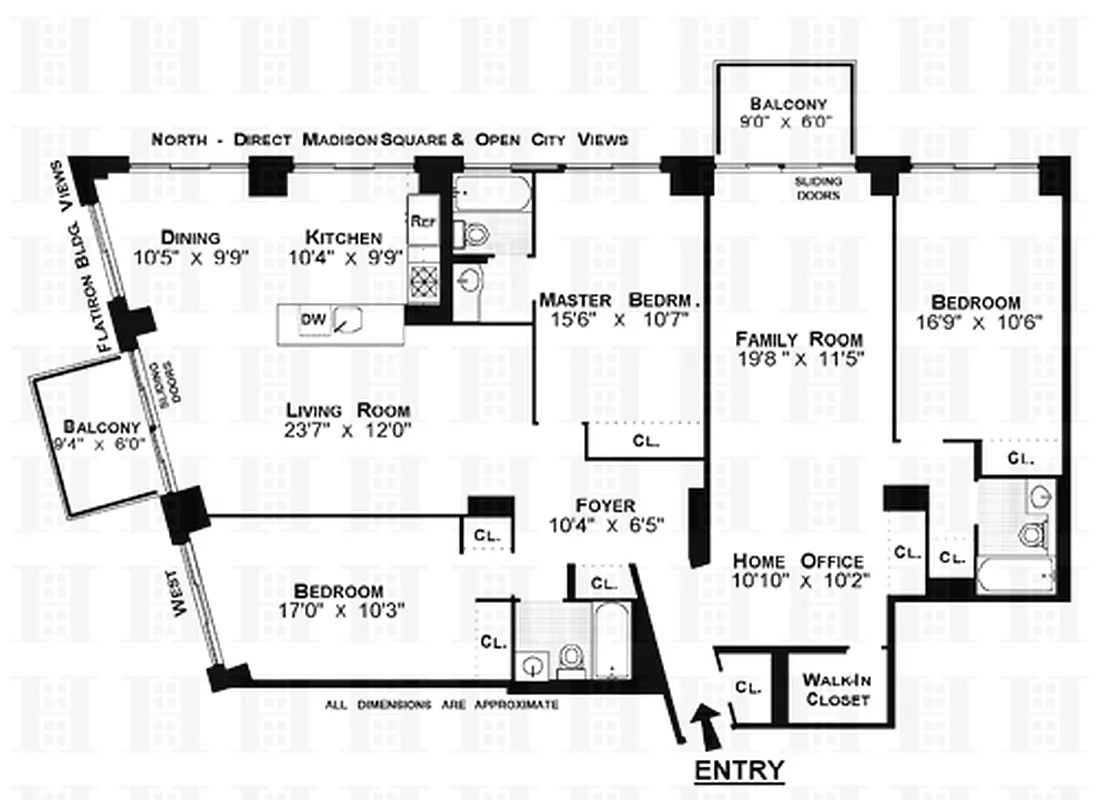 From every window you will be mesmerized by spectacular iconic views! To the North you overlook Madison Square Park with views of the Empire, Chrysler, and MetLife Clock Tower buildings. To the West is the Flatiron Building and the historic Ladies' Mile. This legally combined pristine newly renovated home has three bedrooms, three baths (master is en suite), a spacious family room that can easily become a 4th bedroom, home office, abundant closets/storage and two balconies.