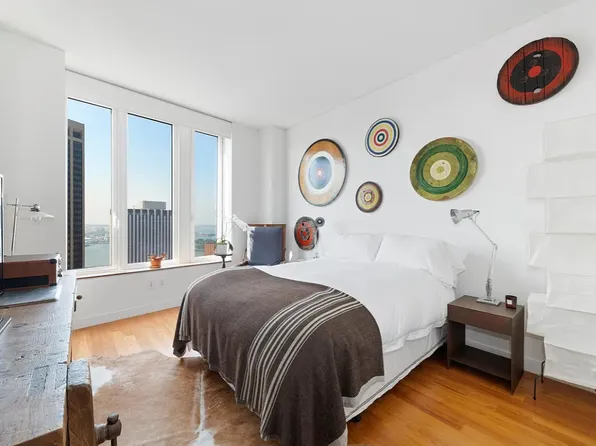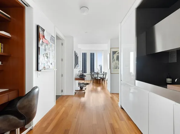 Located at One Brooklyn Bridge Park, this home features soaring 13" ceilings and oversized windows that flood the space with light and offer skyline views over Brooklyn Heights and Downtown Brooklyn. The open living and dining area includes custom built-ins and a chef's kitchen with Dada Italian cabinetry, marble island, Bosch appliances, and Sub-Zero refrigerator.