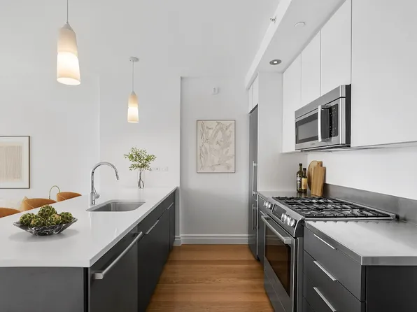 This beautifully crafted 695 square foot one bedroom, one bathroom home features a bright northeast exposure with views of the East River and Williamsburg Bridge. Designed by the acclaimed Meyer Davis Studio, the space showcases warm, contemporary interiors and an open gourmet kitchen with a breakfast bar that blends style and functionality.
