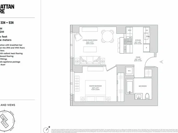 Residence 33J is a 695 sq ft one-bedroom, one-bathroom home with an open gourmet kitchen and breakfast bar. Facing northeast, it offers stunning views of Midtown and the East River. Designed by Meyer Davis Studio, the residence features premium Miele appliances, imported stone and custom finishes, wide stained oak floors, a master bath with marble tile, mosaic floors with radiant heat, custom wood cabinetry, Dornbracht fixtures, and an in-unit washer and dryer.