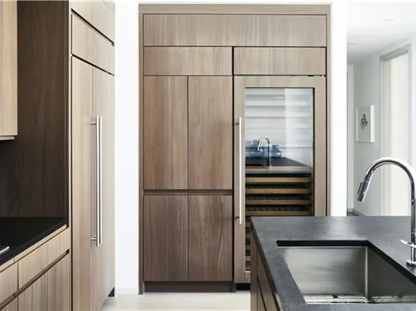 Designed for elegant entertaining, the open gourmet kitchen is outfitted with Gaggenau appliances, custom white oak cabinetry, and Breccia Grigio Eurasia marble beveled countertops and backsplash.