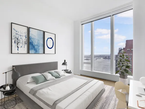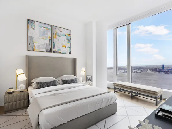 This 1,410-square-foot two-bedroom, two-bathroom residence features One Park Row's signature curved living room with sweeping north, west, and south views.