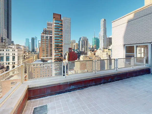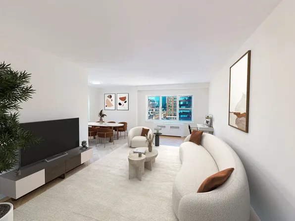 Exceptional triple exposure high floor corner split 2 bedroom, 2 bath home with a pass through kitchen and a wall of windows looking out to the Empire State Building, Chrysler Tower, Midtown Skylines, Hudson River and beyond! Master suite features a windowed bathroom with a stall shower and radiant heated floors and washer/dryer in home.