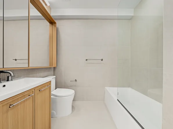 This warm and cozy, 549 square foot, one-bedroom, one-bathroom residence designed by Thomas Juul- Hansen, features an open-living concept with floor-to-ceiling windows displaying scenic Manhattan skyline views.
