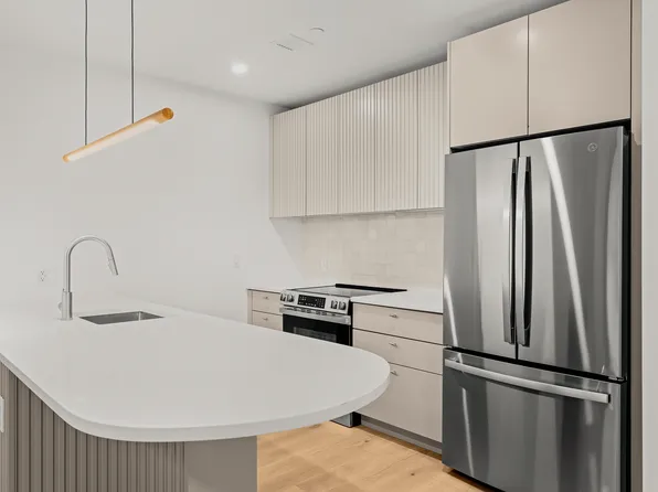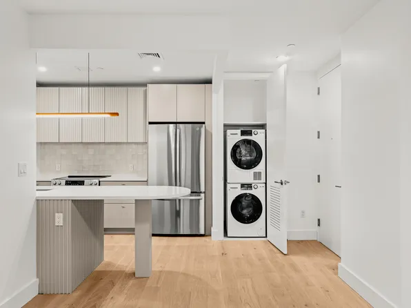 The home opens to a well appointed kitchen featuring super-white quartzite countertop and waterfall island, bronze and tinted mirror glass backsplash, and a wall of white oak cabinetry and pantry providing ample storage.