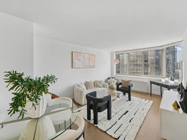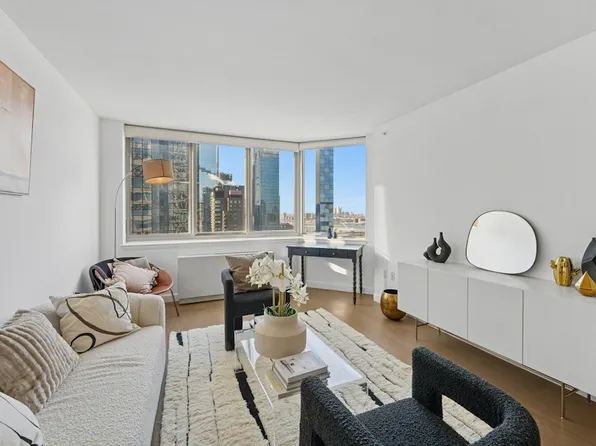 Corner view, beautiful north-facing living room looking onto 42nd Street and Times Square.