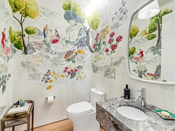 5" plank flooring, sun-filled living/dining room, wrap-around oversized windows, kitchen equipped with a Sub-Zero refrigerator, dual-zone wine fridge, Miele appliances, and ample pantry space, a White Quartz island, Calacatta marble countertops/backsplash, custom millwork, and a garbage disposal.