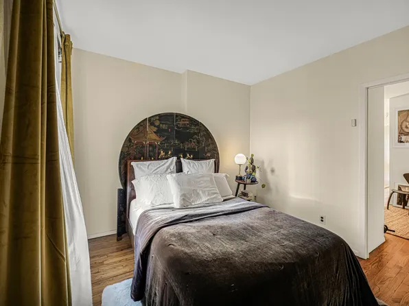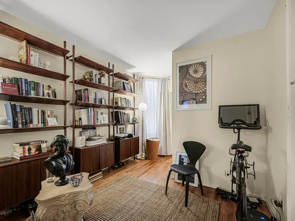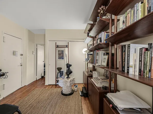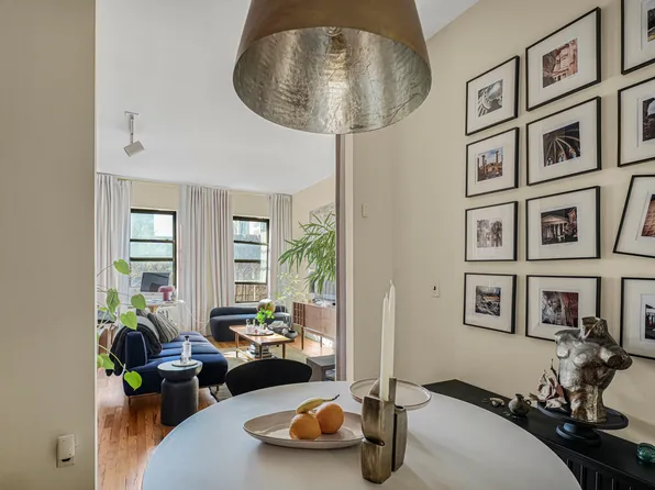 A long, closeted foyer separates the main living quarters of this home from its entrance. At its end, a large, open-plan living and dining/home office area, with west-facing exposures that bathe the unit in afternoon sun. Overlooking an inner courtyard, it is tranquil and inviting.