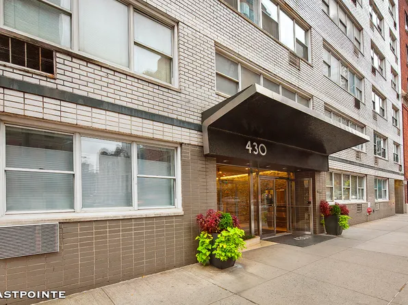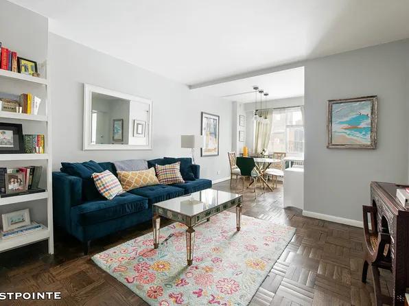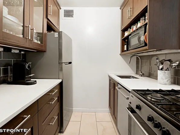 The listing is for a one-bedroom apartment that can be converted into a two-bedroom unit with a full wall, and it has an eastern exposure. The kitchen overlooks the living room and features a breakfast bar and stainless steel appliances, including a dishwasher and microwave.