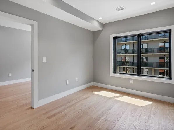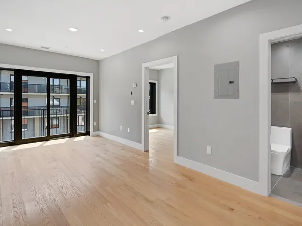 Located in the heart of Flatbush, this apartment features an open living and kitchen area with floor-to-ceiling windows that fill the space with natural light. The kitchen is outfitted with GE stainless steel appliances, a dishwasher, microwave, and a large Beko refrigerator.