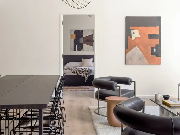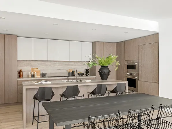 This graciously scaled 1,358 square foot split two-bedroom, two and a half bath residence was designed by Paris Forino. The gorgeous open kitchen is equipped with Calacatta marble countertops, custom Italian cabinetry, blackened metal hardware, and Appliances by Wolf, Bosch and Sub-Zero.