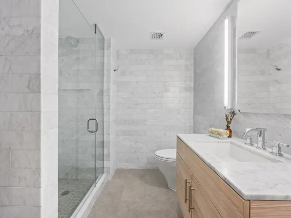 Enjoy Empire State Building views through floor-to-ceiling windows from this corner one bedroom residence in the new David Chipperfield Architects designed building on Bryant Park. The custom made aggregate terrazzo facade transitions seamlessly into the interiors of this 1,067 square foot mega luxurious one bedroom, creating crisp architectural frames to the nine floor-to-ceiling windows and a border for the heated oak herringbone floors.