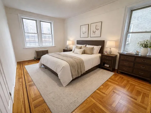 No-fee studio apartment located on the Grand Concourse in The Bronx. Apartment features a large living space with separate sleeping alcove, hardwood floors, and abundant closet space. The Capri is a 24-hour doorman building with amenities including an on-site parking garage and elevator. Images may reflect either a model unit or comparable apartment with a similar layout and/or finishes.