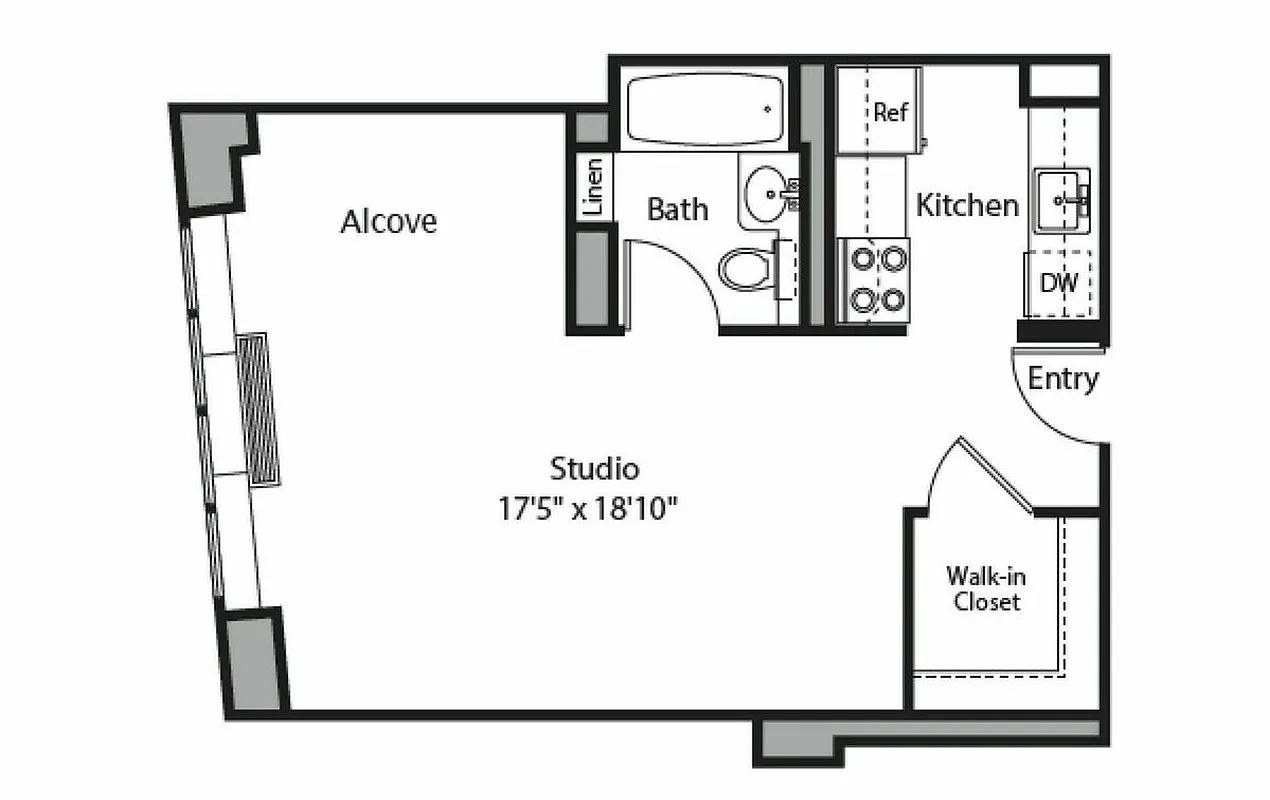 Bright studio with floor to ceiling windows showcasing views across Bowery. This great apartment has room for a separate sleeping and living area, a newly renovated kitchen with stainless steel appliances and stone countertops, a walk-in closet, new wood floors and an updated bath.