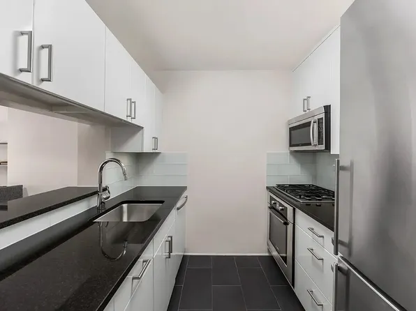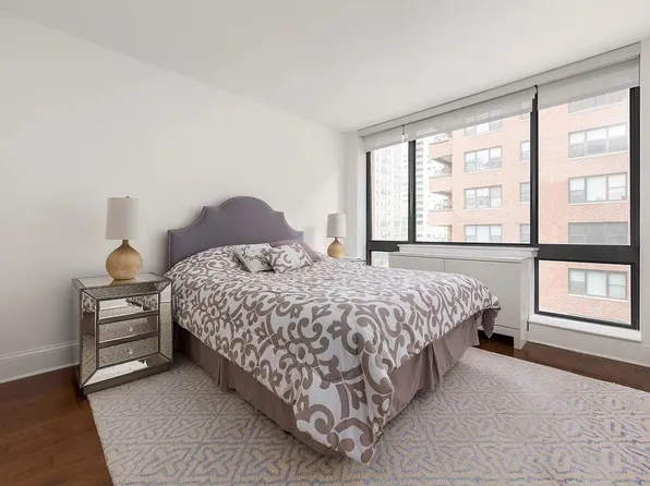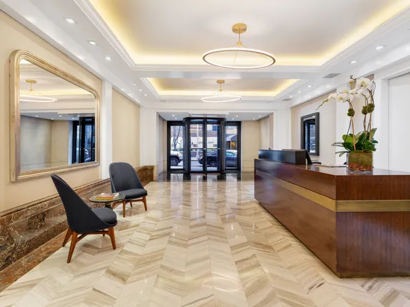 This north-facing one-bedroom apartment boasts a generously spacious closet, one of the most capacious you'll find in a one-bedroom unit. The elegant interior features hardwood floors and Italian marble-tiled shower in the bathroom. The kitchen is equipped with a Sub-Zero refrigerator and a dishwasher.