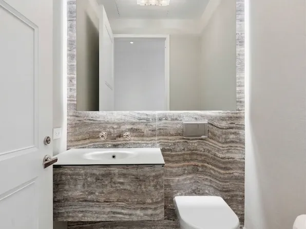 Upon entry, one is greeted by a large foyer and stunning powder room with precious stone walls and cove lighting.