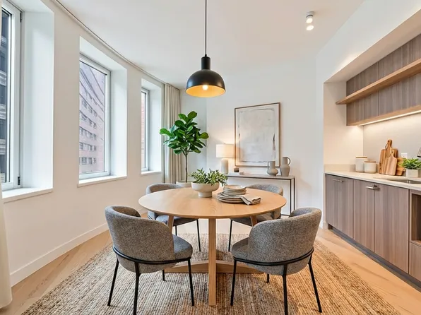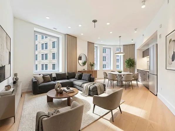This bright and airy corner 1,317 SF apartment boasts 11 oversized windows which face north, south and east. The apartment features incredible views of several landmark buildings including The New York Stock Exchange and The Federal Reserve.