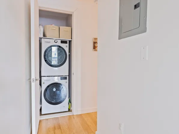 The spacious open floor plan is perfect for modern living, featuring solid white oak floors and a fully vented GE washer and dryer.