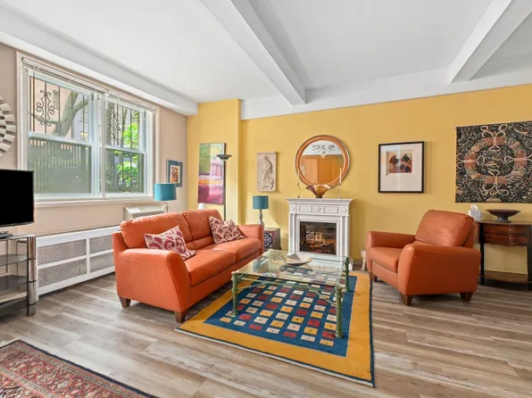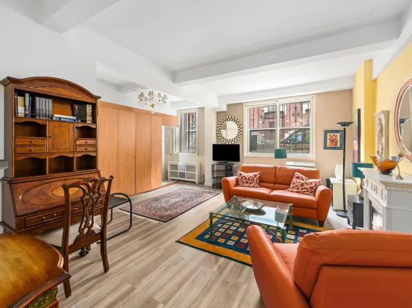 Junior one-bedroom at the full-service Leslie House cooperative in Midtown East. The living area offers plenty of room for lounging with friends around the TV, as well as separate space for dining conveniently off the kitchen. French doors open to the convertible bedroom that can accommodate a queen-size bed and bedroom furniture.