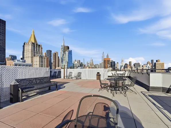 The building features a 24-hour concierge, a roof terrace, a roof deck, a communal workspace, a gym, and a laundry room.