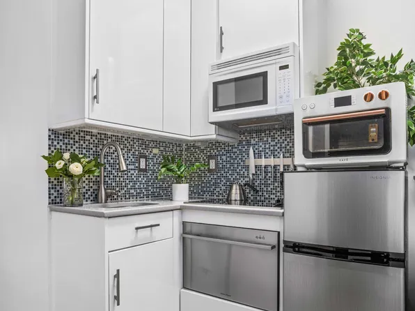 Welcome to Residence 9A at 201 West 21st Street, a beautifully renovated studio perched on a high floor of The Piermont, a full-service co-op in the heart of Chelsea. This bright, stylish home is situated on the quiet side of the building, overlooking open views of West Chelsea and charming townhouse gardens. Natural light floods the space through a west-facing window, enhancing the airy, inviting atmosphere.