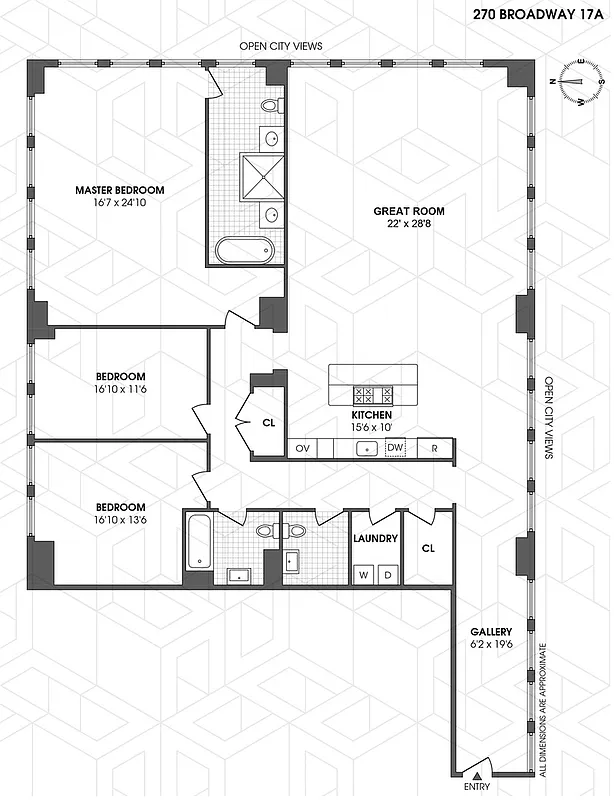 Residence 17A at 270 Broadway is an extraordinary corner 3BR on the 17th floor with views overlooking City Hall Park, the Brooklyn Bridge, and East River. With approximately 2800SF of interior space, the expansive 3 bedroom, 2.5 bathroom home boasts high ceilings, walls of windows on 3 sides, and a gracious entry gallery.