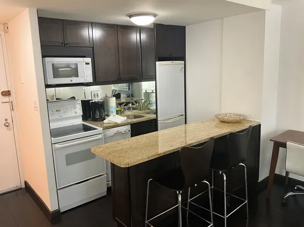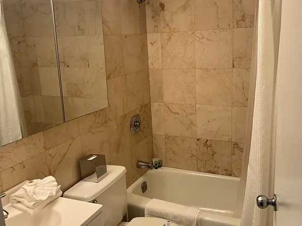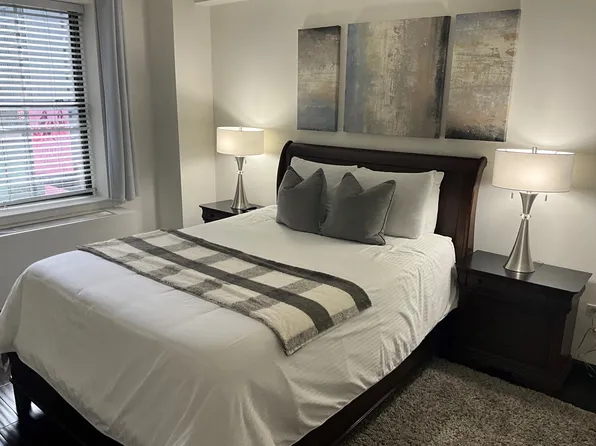 This oversized one-bedroom (convertible two-bedroom) spans 750+ sq ft and features abundant natural light, a spacious living area, king-size bedroom, and a renovated marble-tile bath. The kitchen is equipped with stainless steel appliances, including a dishwasher and microwave.