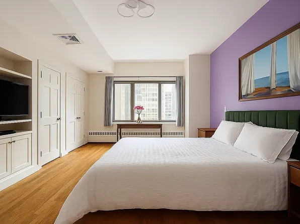 Renovated kitchen with stainless steel appliances w/ dishwasher, renovated bathroom and ample closet space. Oak wood floors, central A/C and heating units – Bedrooms comfortably fits a Queen-size bed and more.