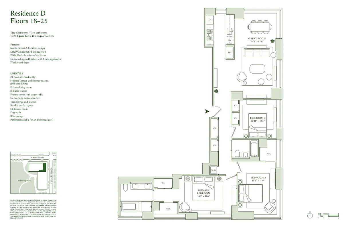 Southwest corner three-bedroom, two-bathroom Residence 18D spans 1,573 square feet and features iconic NYC landmark views. This meticulously detailed residence with beautiful interiors by Robert A.