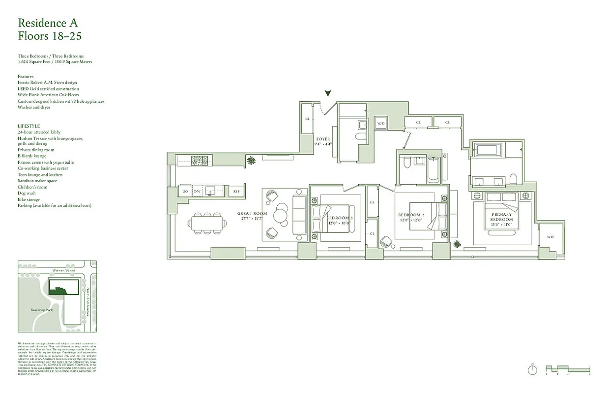 Southwest corner three-bedroom, three-bathroom Residence 19A spans 1,624 square feet and features partial Hudson River and serene tree-lined Tear Drop Park views.