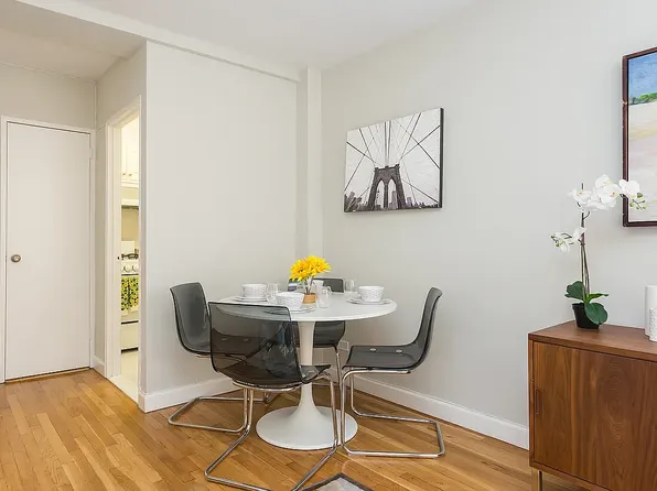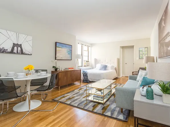 This newly renovated, expansive studio apartment showcases a contemporary and elegant living experience. The apartment features a renovated kitchen with Smeg appliances, high ceilings, three large closets, and an abundance of natural light throughout from south-facing windows.